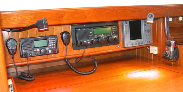 Instruments include: VHF with NNMI (and Ram Mike at the helm), SSB, Plotter, and handheld VHF